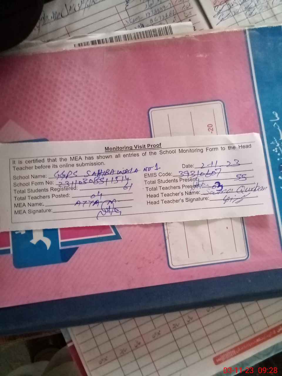 | Attendance Register | Head Teacher | MEA with School | Visit Proof |