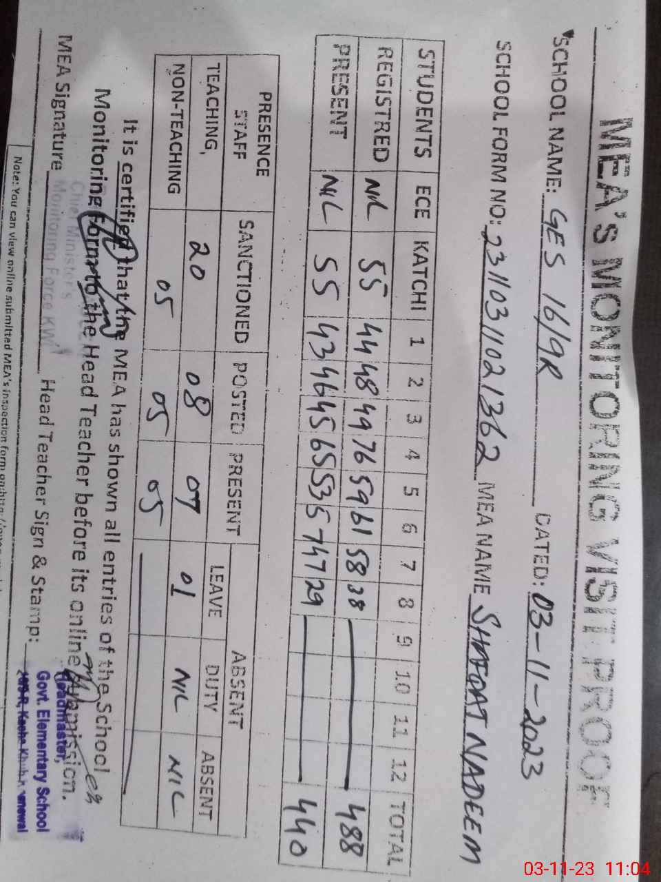 | Attendance Register | Head Teacher | MEA with School | Visit Proof |