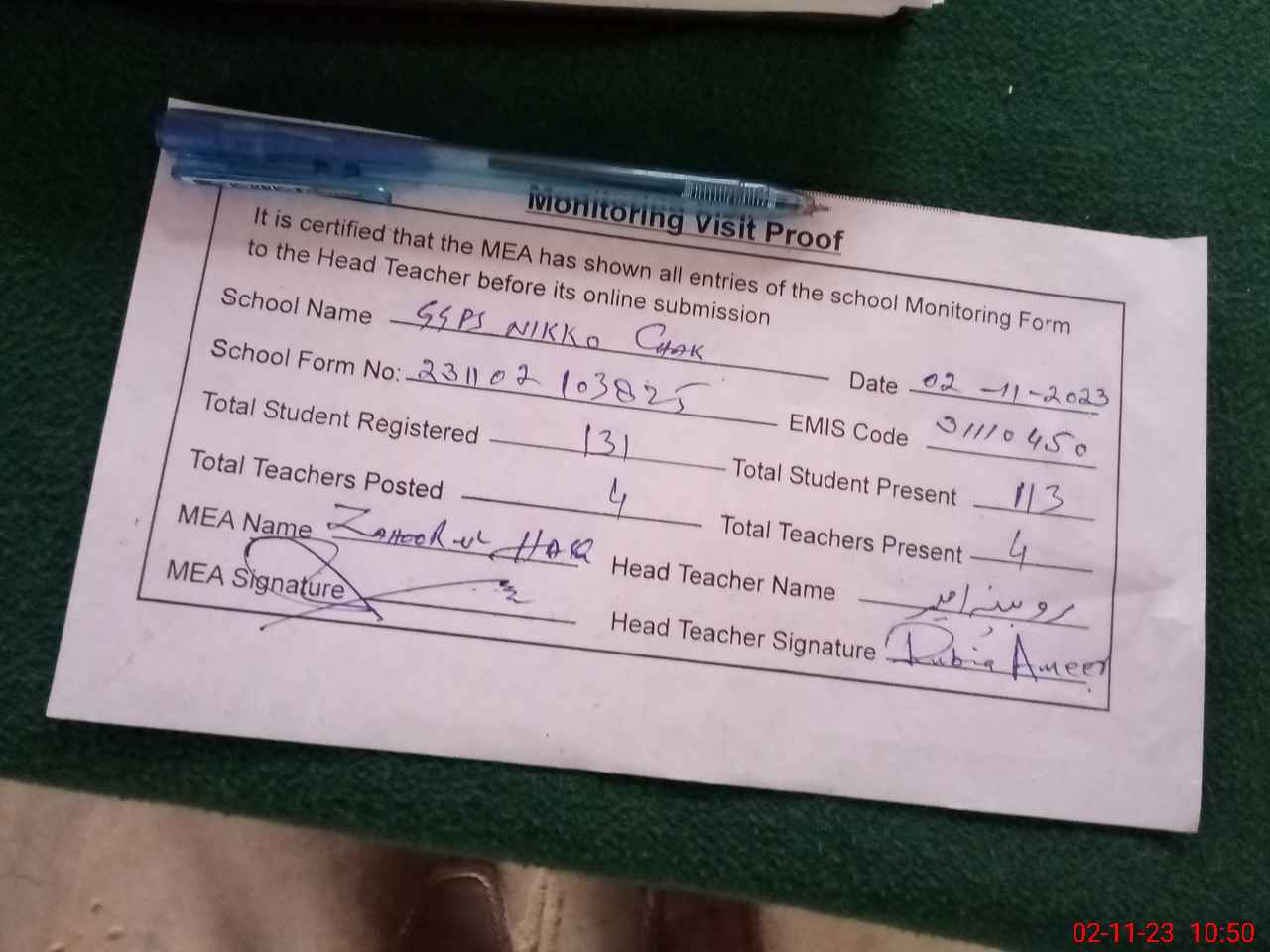 | Monitoring Date: 02-11-2023 | Start Time: 02-11-2023 10:31 AM | End Time: 02-11-2023 10:50 AM | Name of MEA: Za**** BN**** | |
