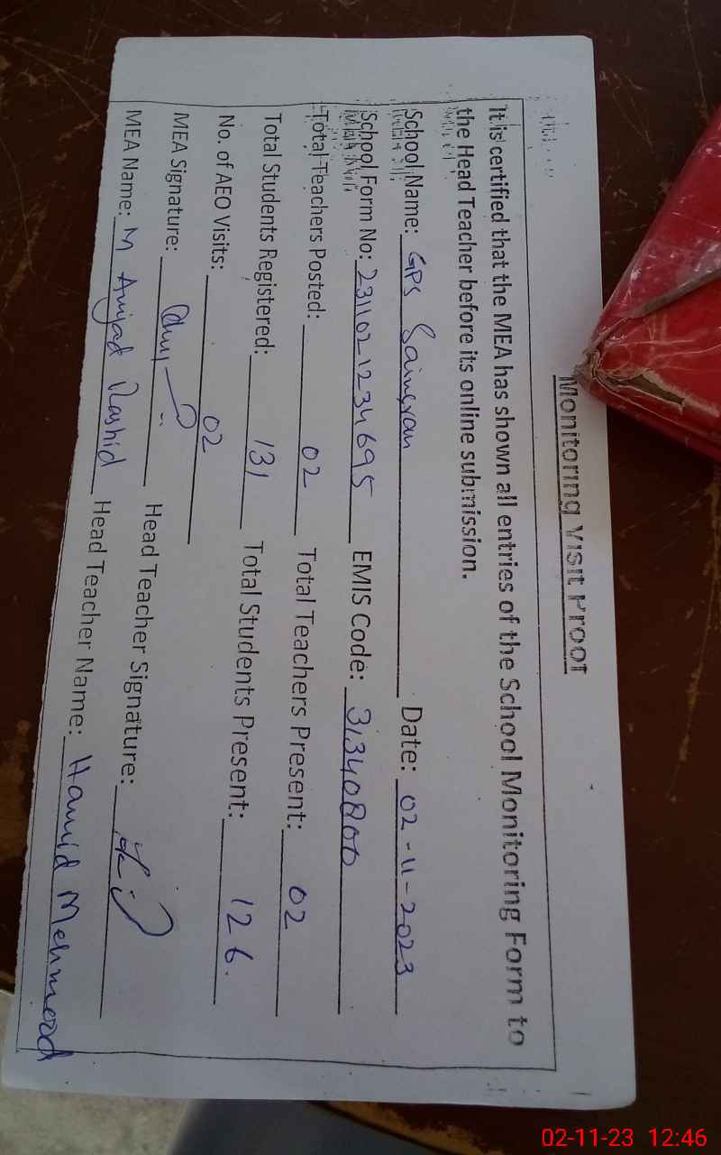 | Attendance Register | Head Teacher | MEA with School | Visit Proof |
