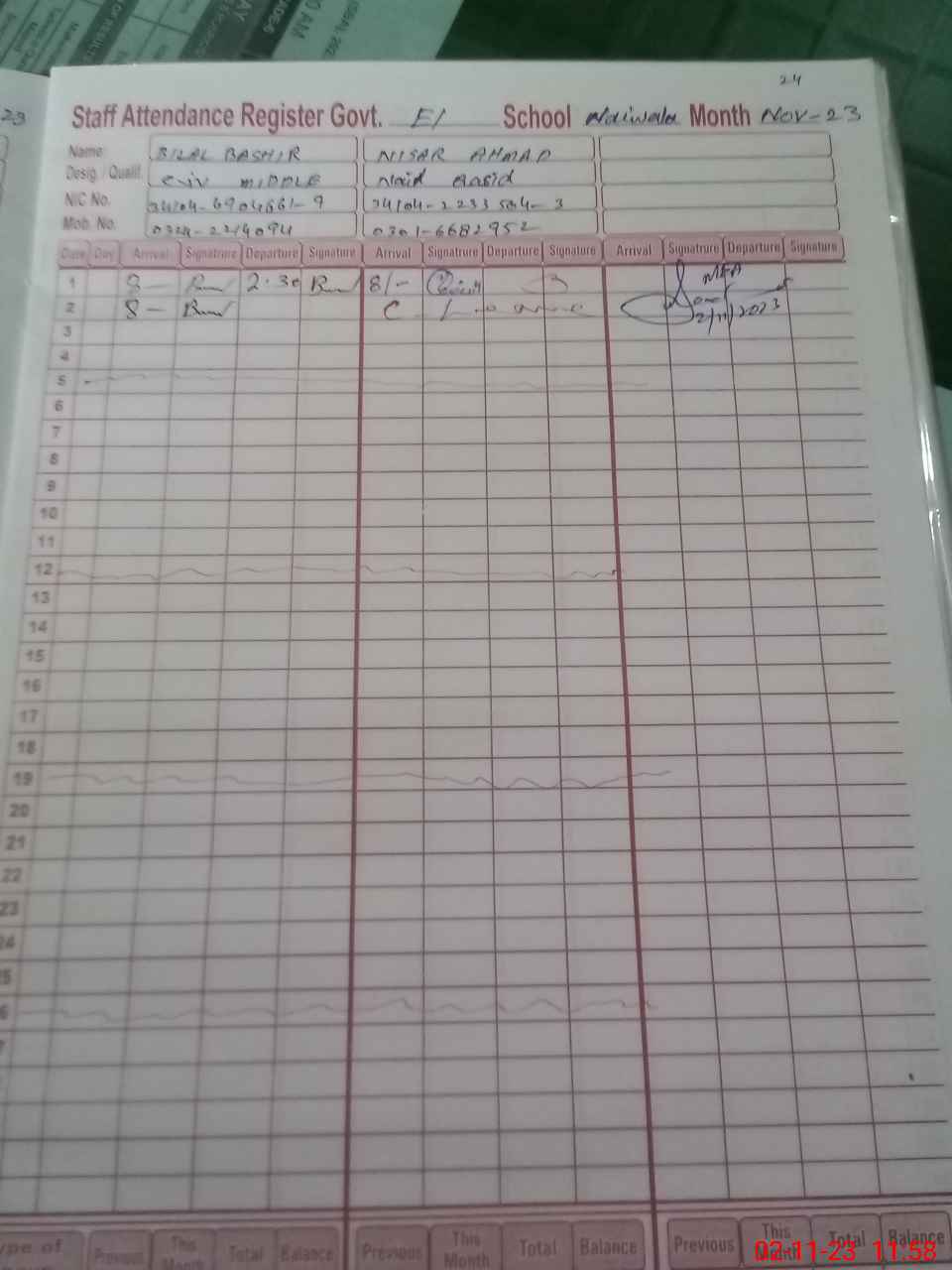| CNIC | Full Name | Designation | R/C | Absence During Last Calender Month |