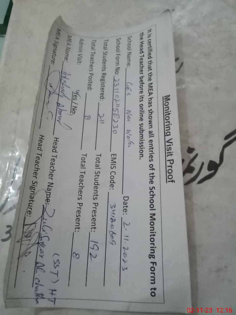 | Attendance Register | Head Teacher | MEA with School | Visit Proof |