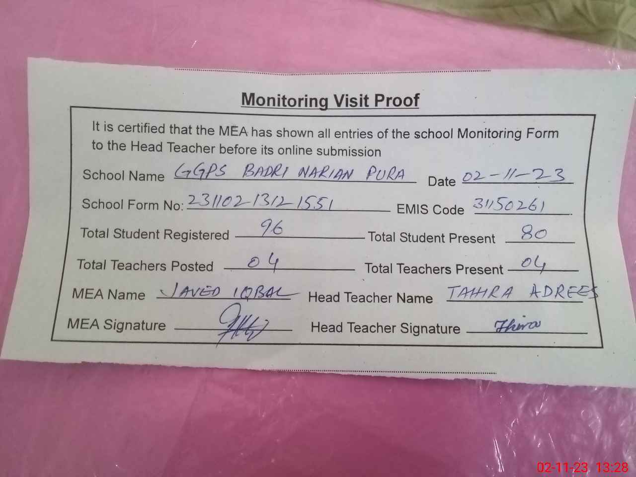 | EMIS Code: 31150261 | Name of School: GGPS BADRI NARAIN PURA | |||