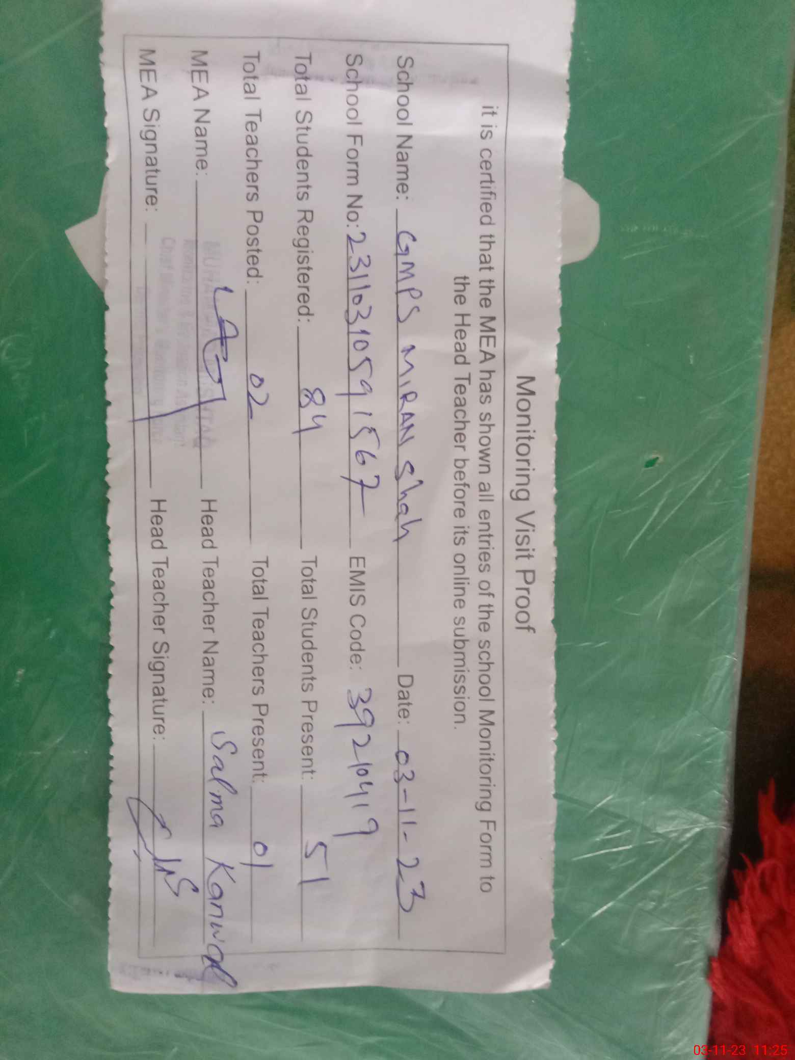 | Attendance Register | Head Teacher | MEA with School | Visit Proof |