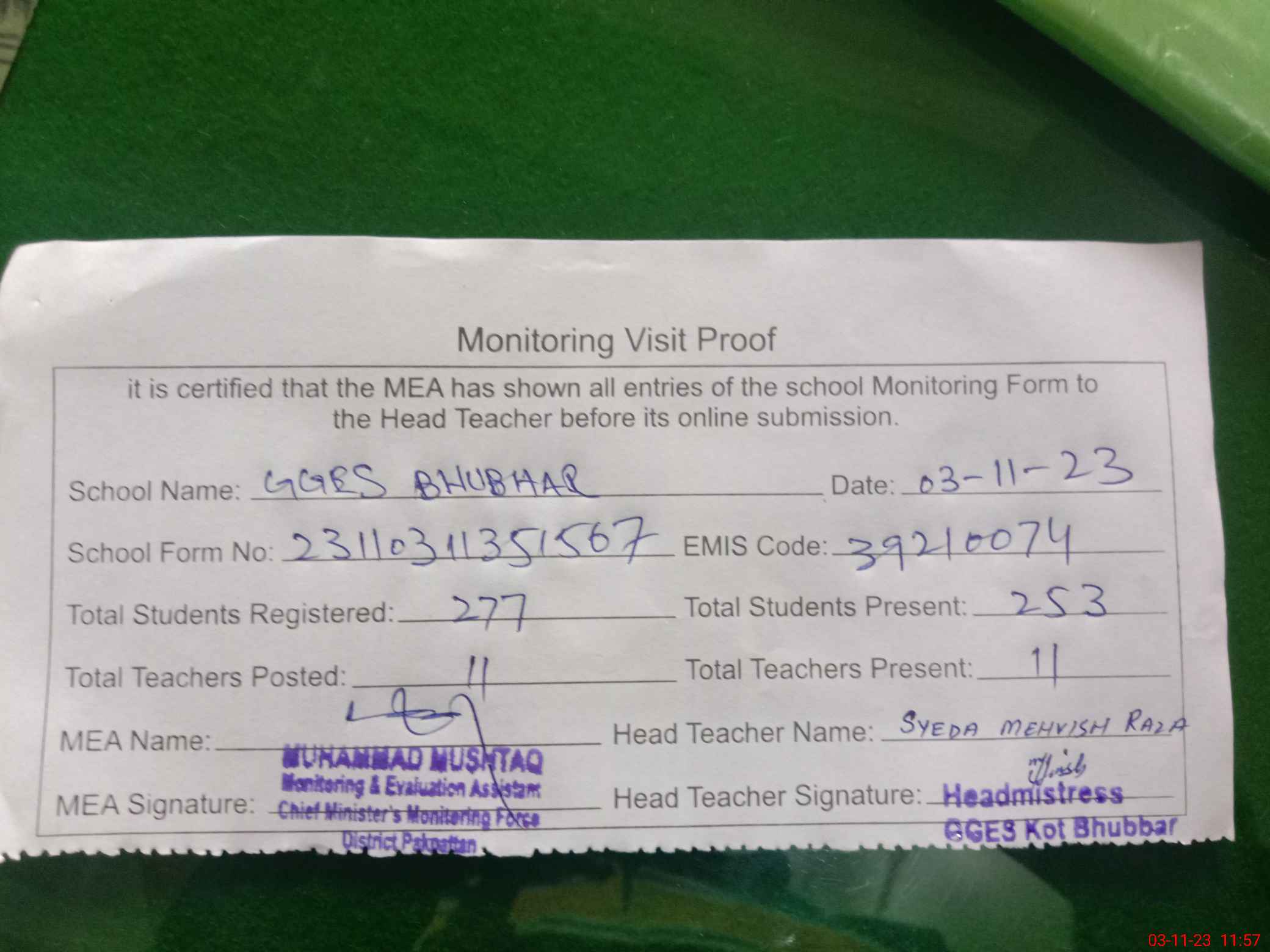 | Attendance Register | Head Teacher | MEA with School | Visit Proof |