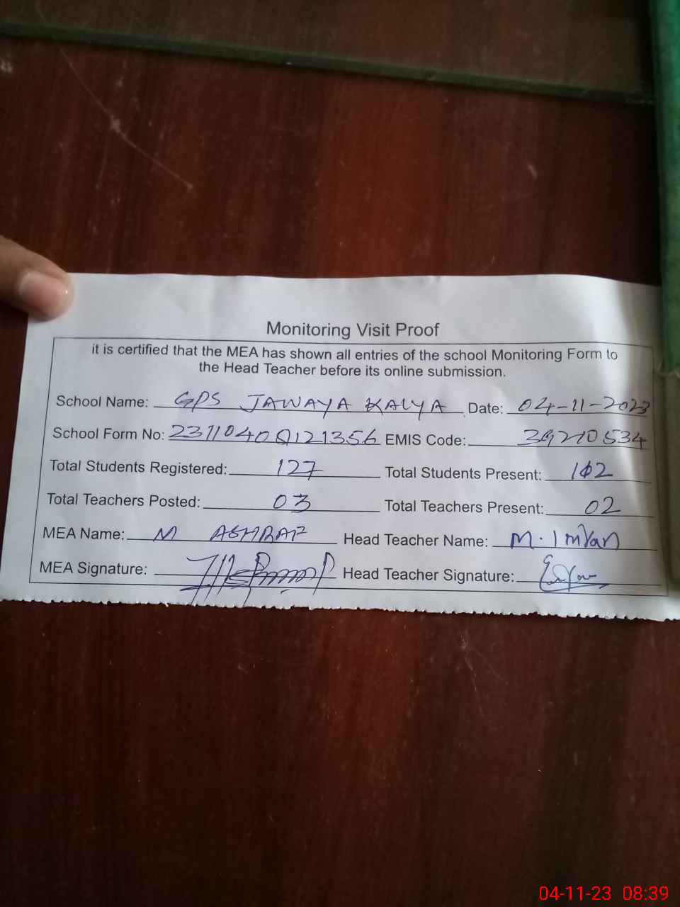 | Attendance Register | Head Teacher | MEA with School | Visit Proof |