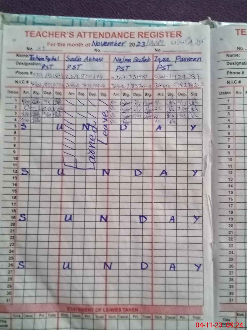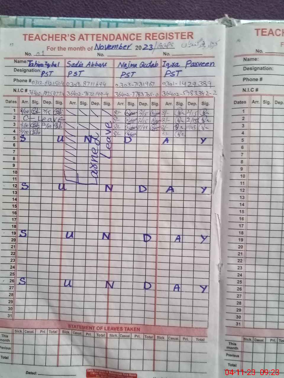 | CNIC | Full Name | Designation | R/C | Absence During Last Calender Month |