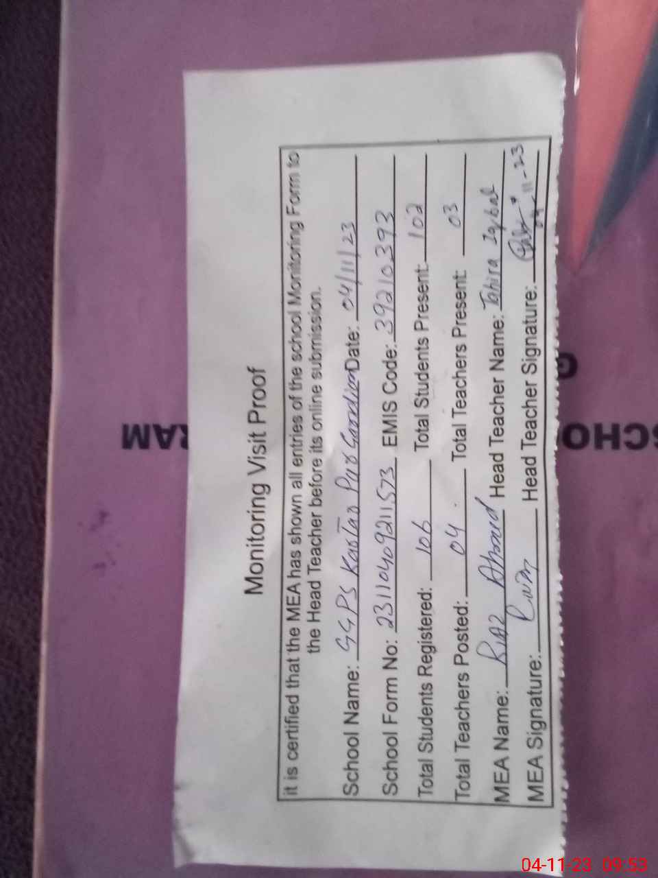 | Attendance Register | Head Teacher | MEA with School | Visit Proof |