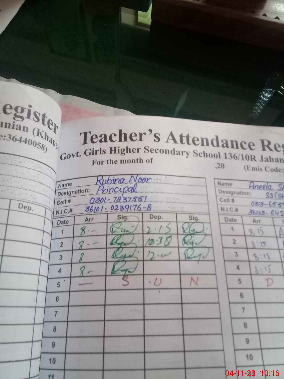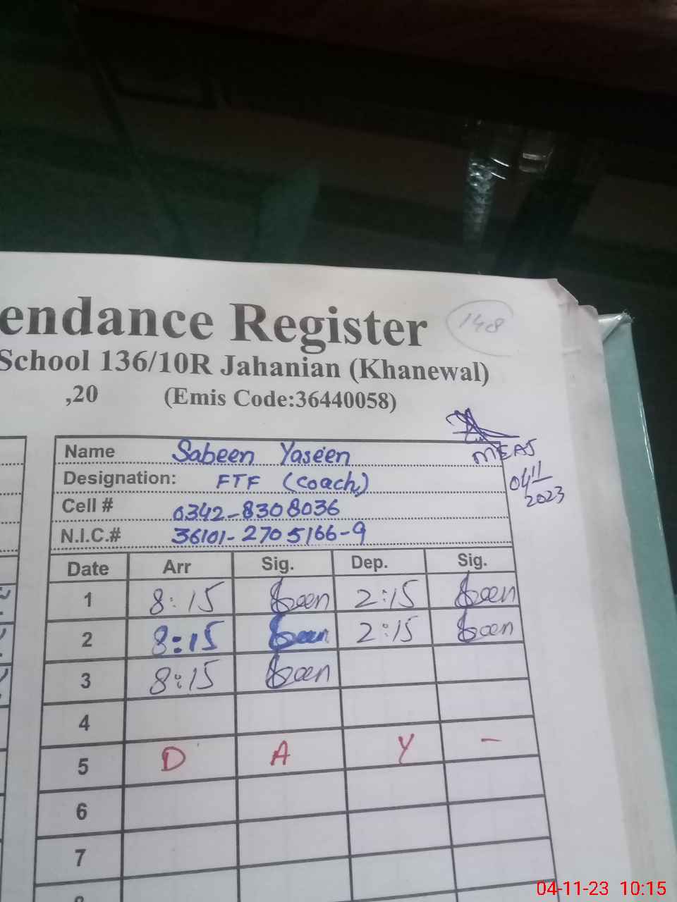| CNIC | Full Name | Designation | R/C | Absence During Last Calender Month |