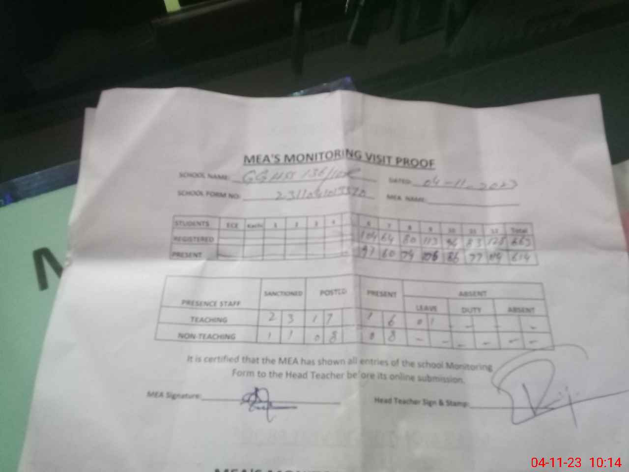 | Attendance Register | Head Teacher | MEA with School | Visit Proof |
