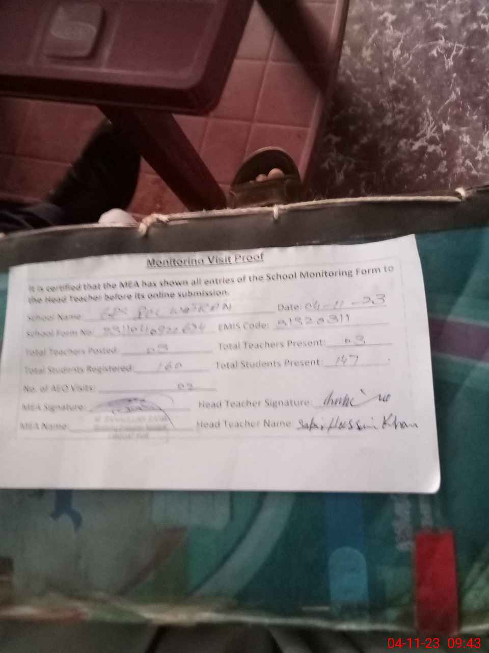 | Attendance Register | Head Teacher | MEA with School | Visit Proof |