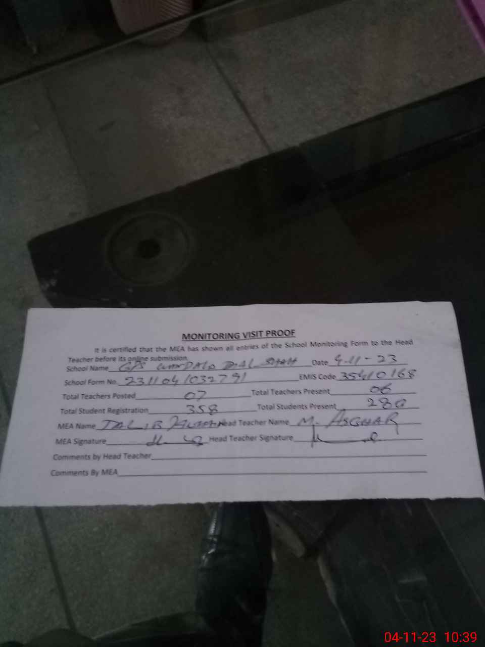 | Attendance Register | Head Teacher | MEA with School | Visit Proof |