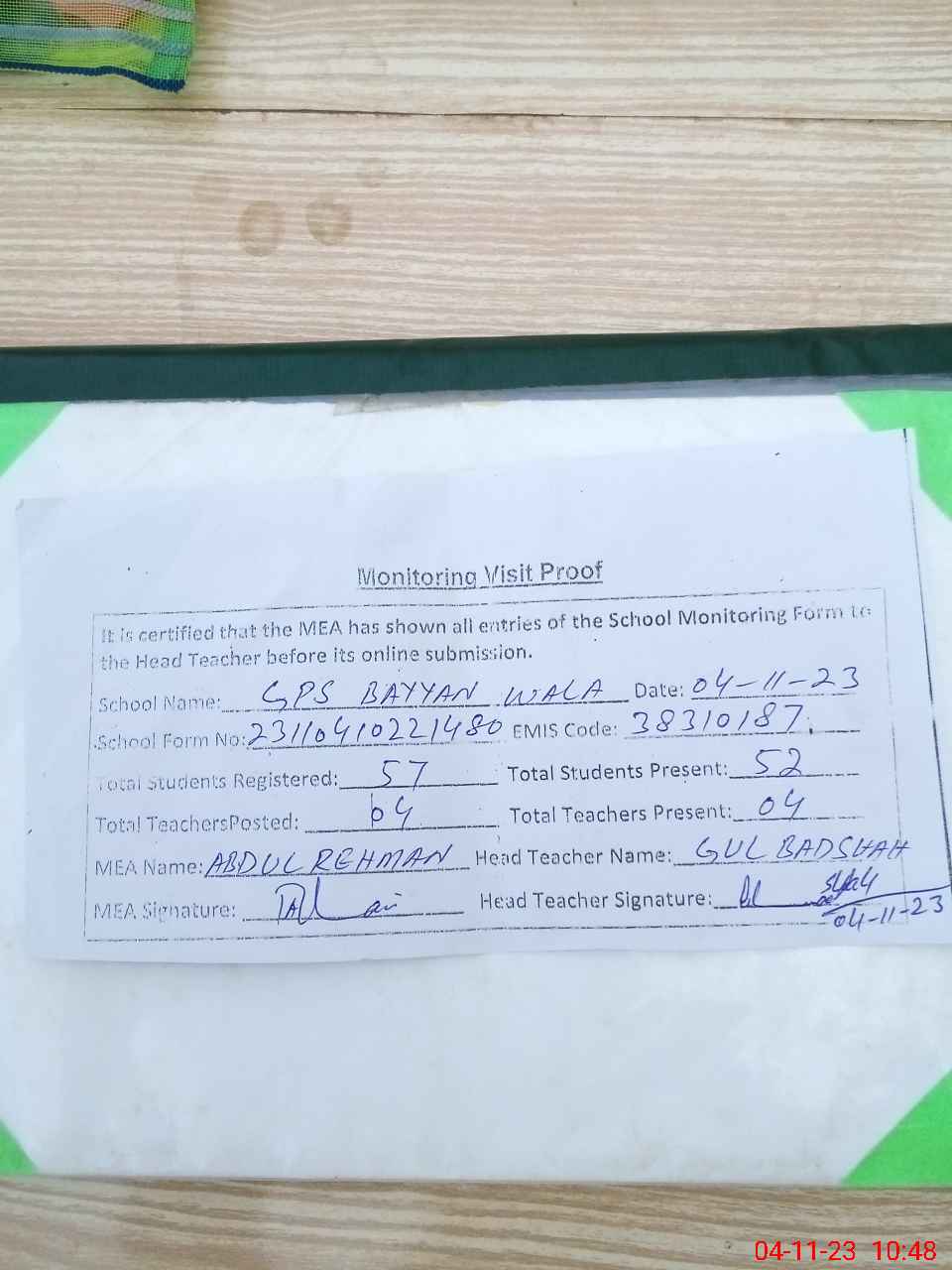 | Attendance Register | Head Teacher | MEA with School | Visit Proof |