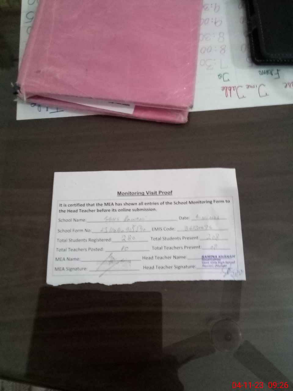 | Name: Ma**** Za**** Designation: (School Headmaster's/Headmistress's) HEADMISTRESS Phone/Cell Number: 03**** |