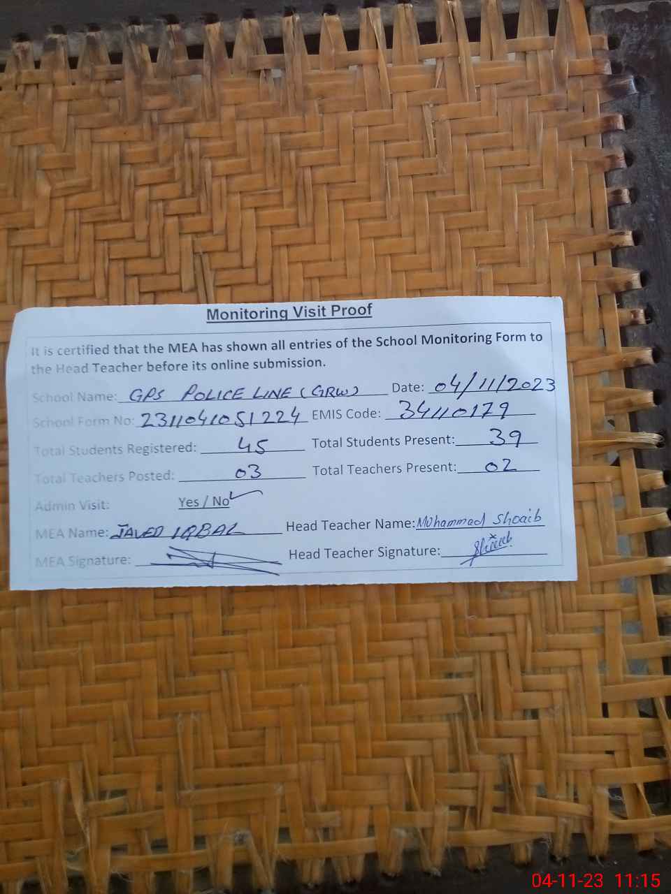 | Attendance Register | Head Teacher | MEA with School | Visit Proof |