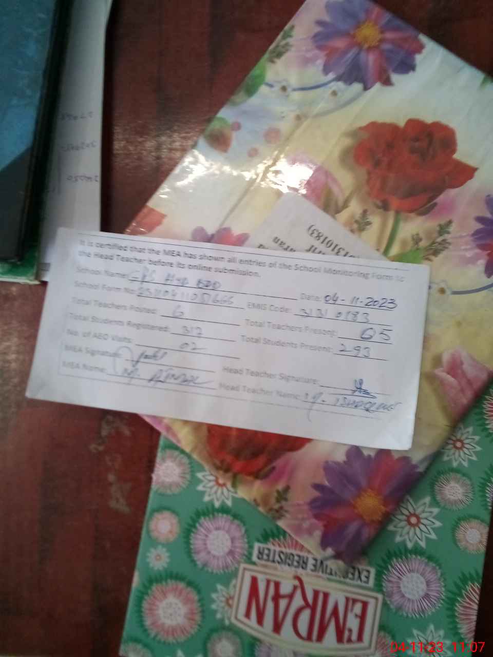 | Attendance Register | Head Teacher | MEA with School | Visit Proof |