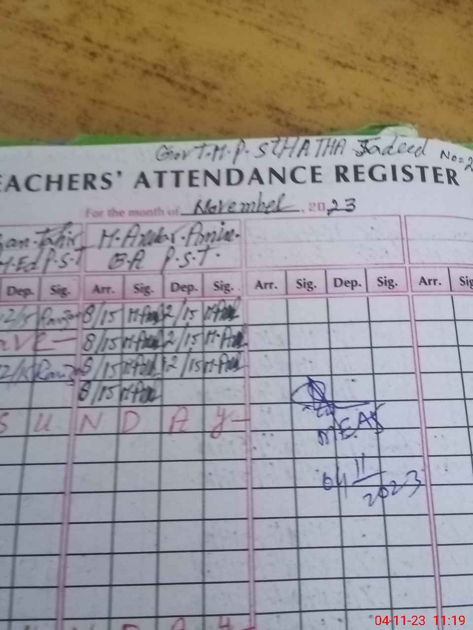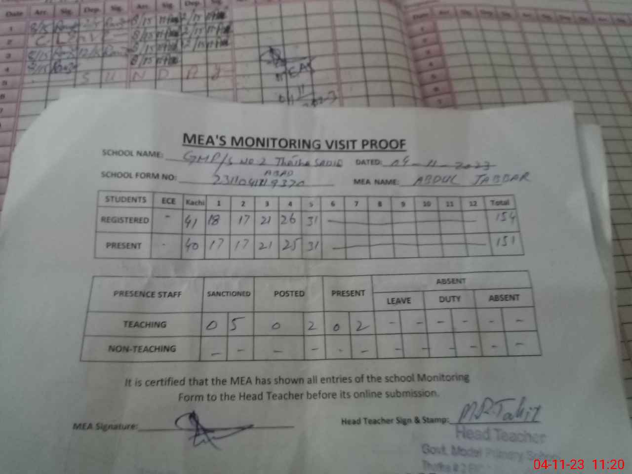 | Attendance Register | Head Teacher | MEA with School | Visit Proof |