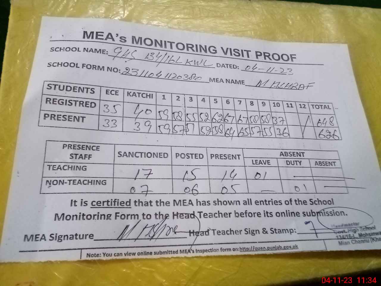 | Attendance Register | Head Teacher | MEA with School | Visit Proof |