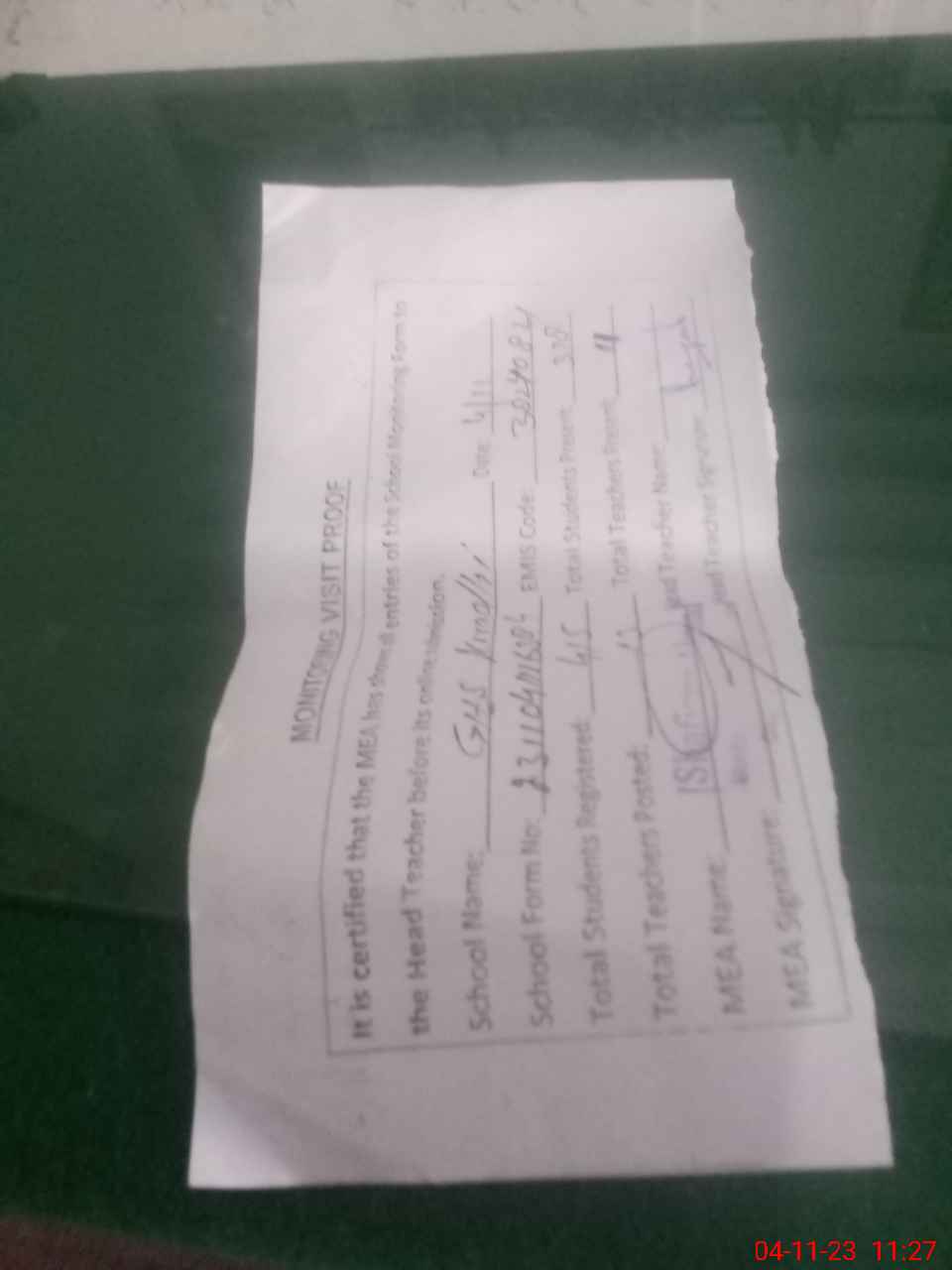 | Attendance Register | Head Teacher | MEA with School | Visit Proof |