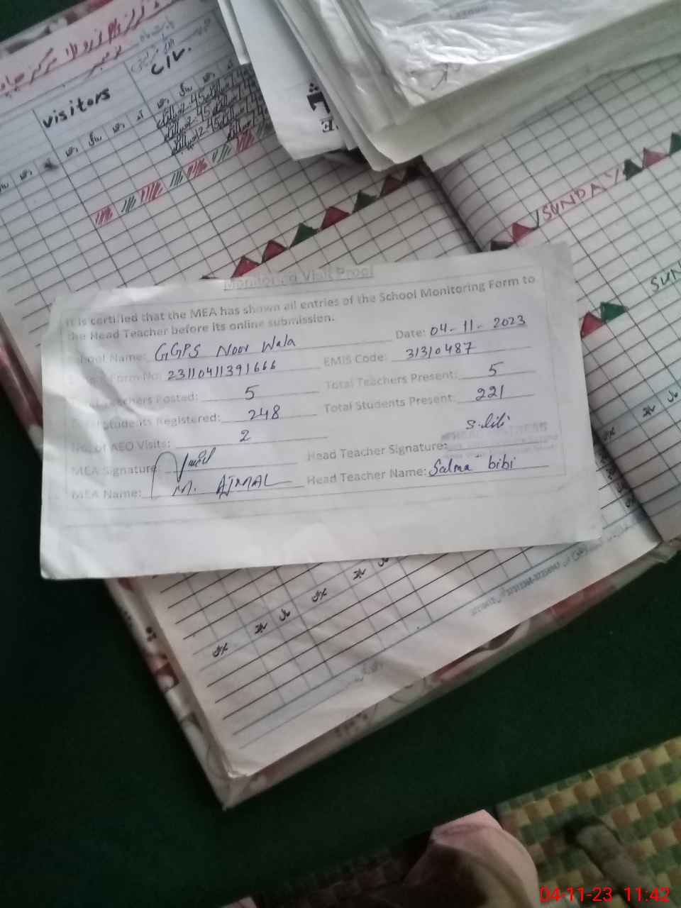 | Attendance Register | Head Teacher | MEA with School | Visit Proof |