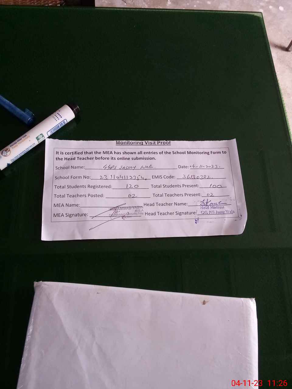 | Attendance Register | Head Teacher | MEA with School | Visit Proof |