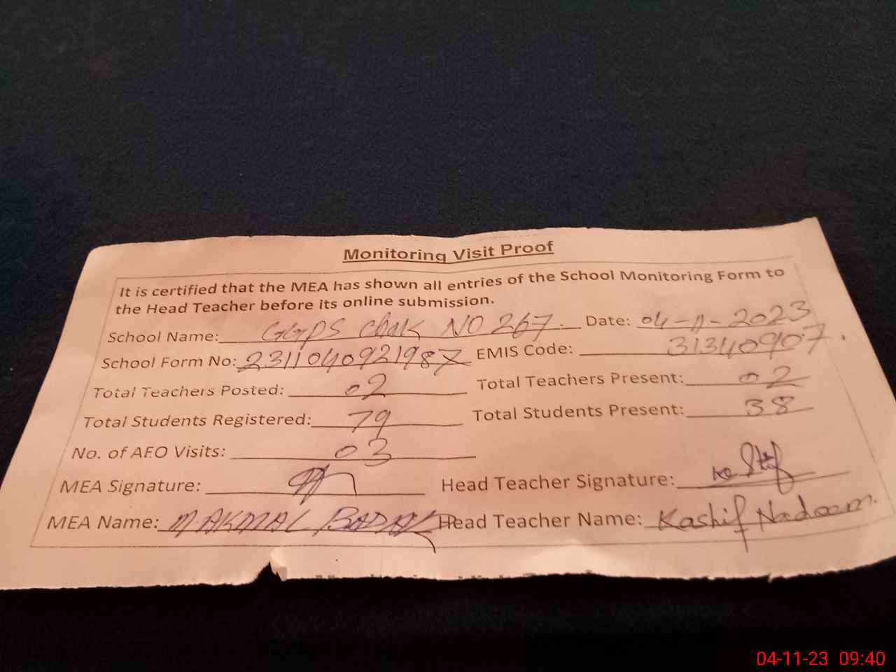 | Attendance Register | Head Teacher | MEA with School | Visit Proof |