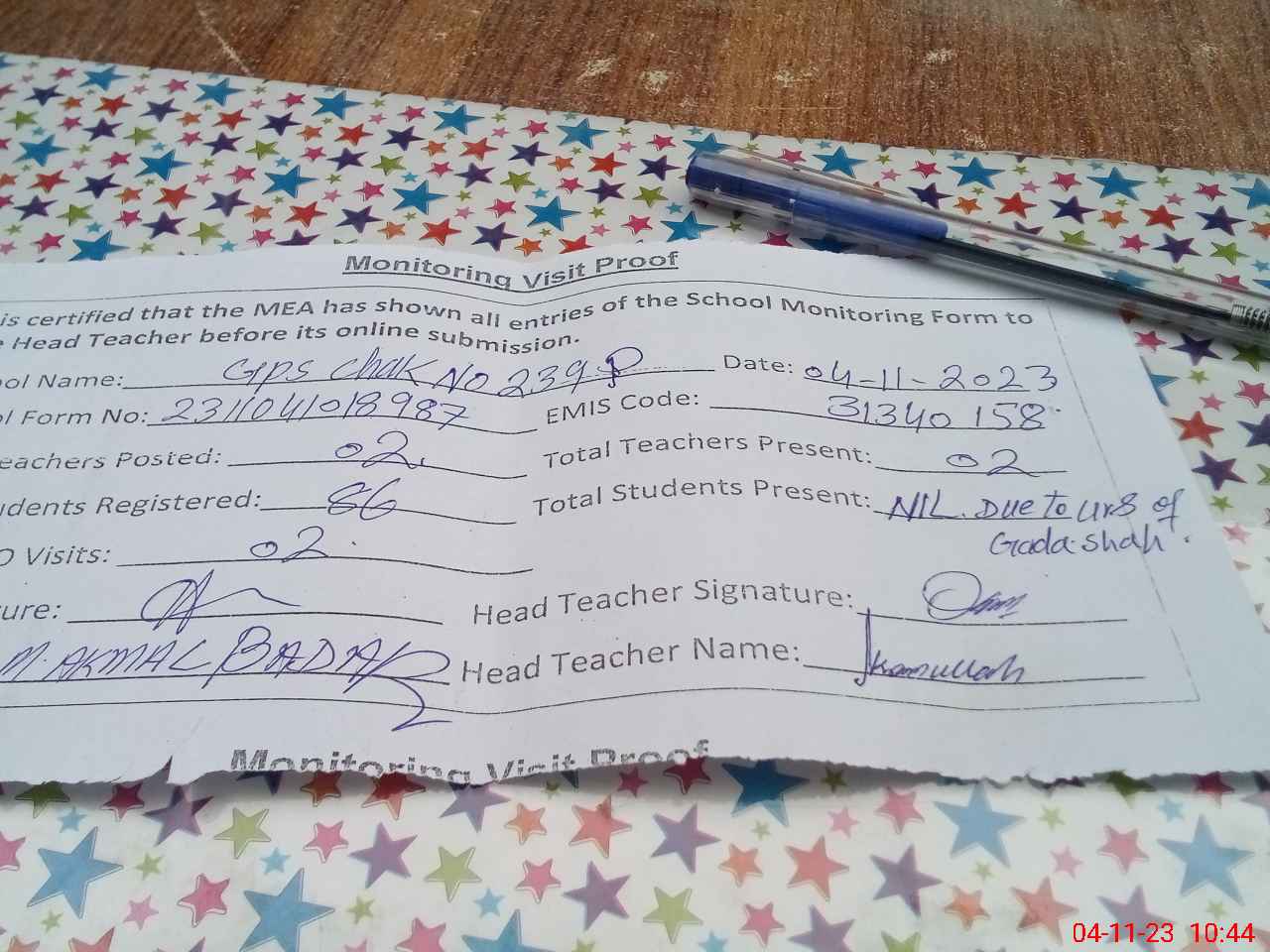 | Attendance Register | Head Teacher | MEA with School | Visit Proof |