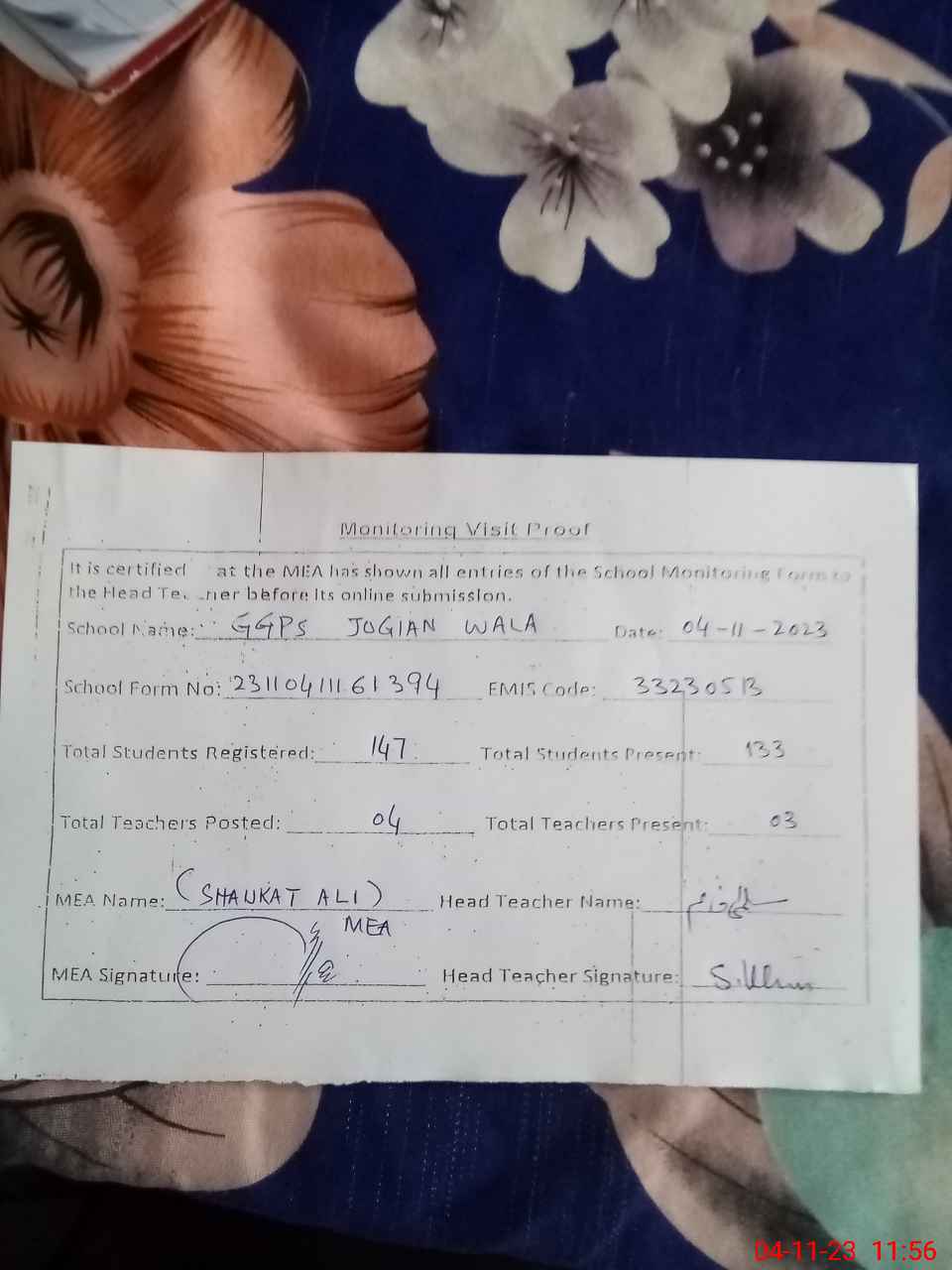 | EMIS Code: 33230513 | Name of School: GGPS JOGIAN WALA | |||