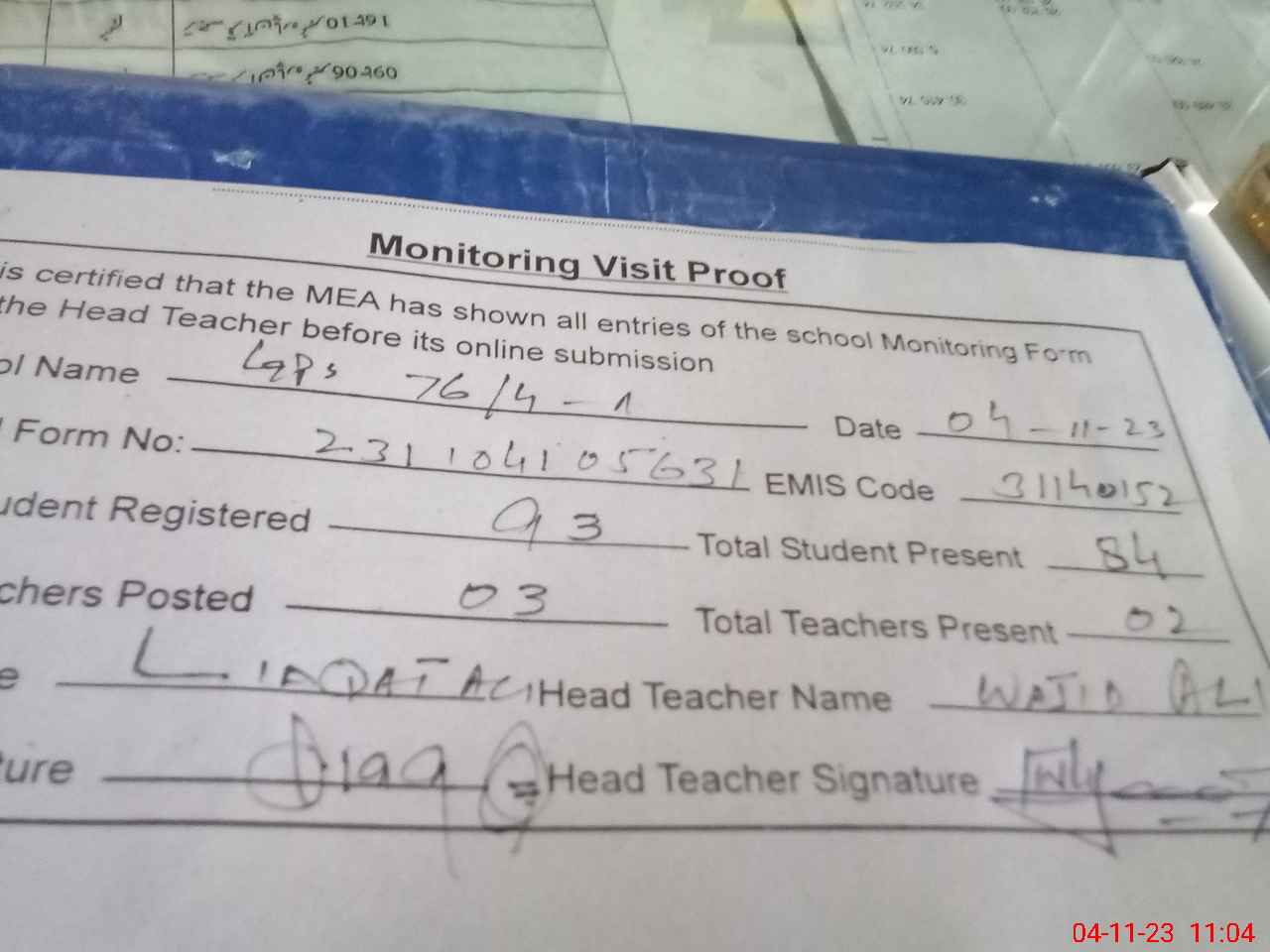 | Attendance Register | Head Teacher | MEA with School | Visit Proof |