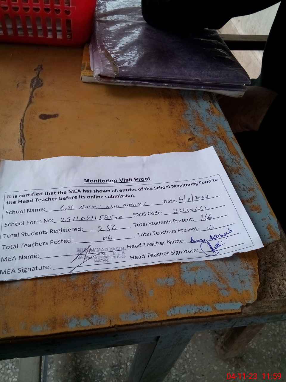 | Attendance Register | Head Teacher | MEA with School | Visit Proof |