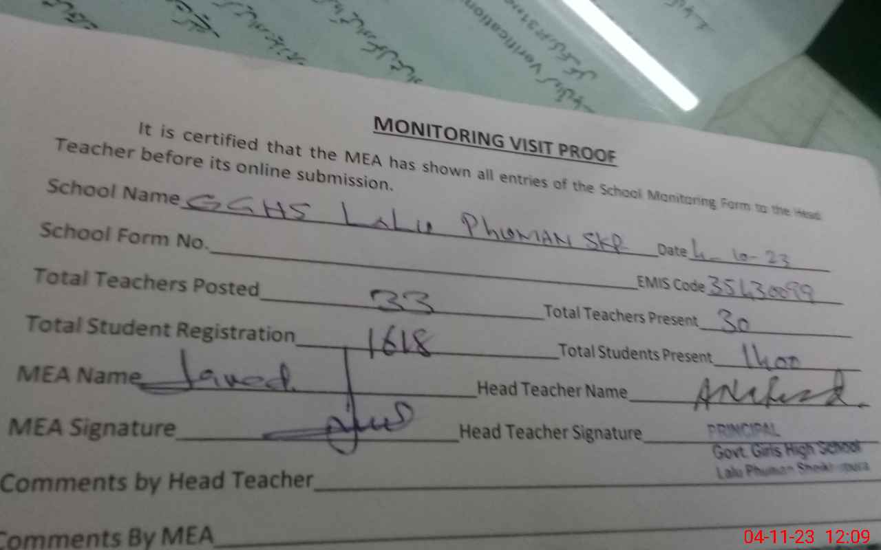 | EMIS Code: 35430099 | Name of School: GGHS LALU PHUMAN SHEIKHUPURA | |||