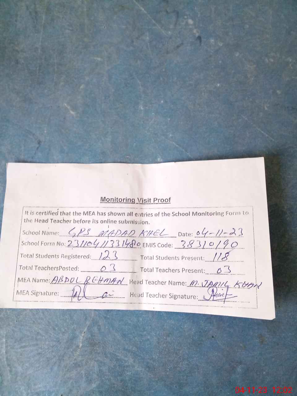| Attendance Register | Head Teacher | MEA with School | Visit Proof |