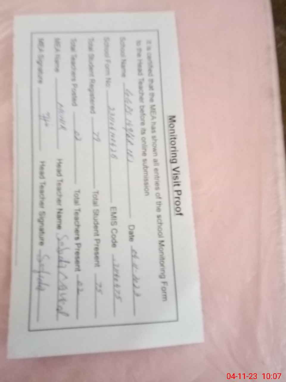 | Attendance Register | Head Teacher | MEA with School | Visit Proof |