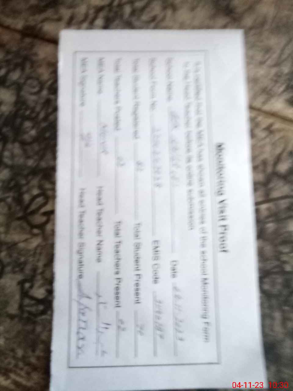 | Attendance Register | Head Teacher | MEA with School | Visit Proof |