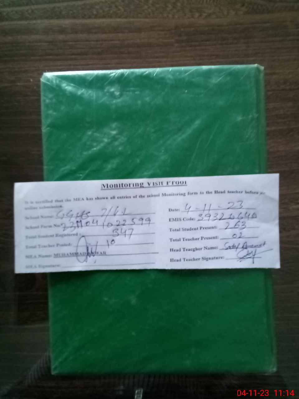 | Attendance Register | Head Teacher | MEA with School | Visit Proof |