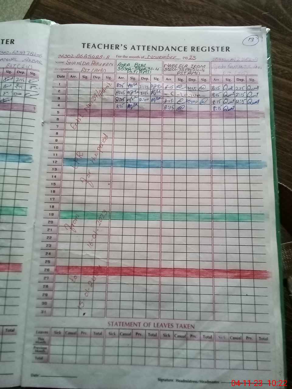 | Leave | Duty | Absent | Maternity | Medical | Ex- Pak |