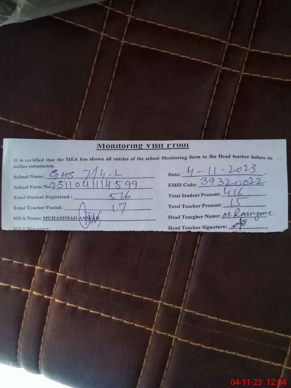 | EMIS Code: 39320022 | Name of School: GHS 7/4-L OKARA | |||