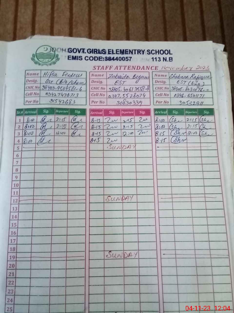 | CNIC | Full Name | Designation | R/C | Absence During Last Calender Month |