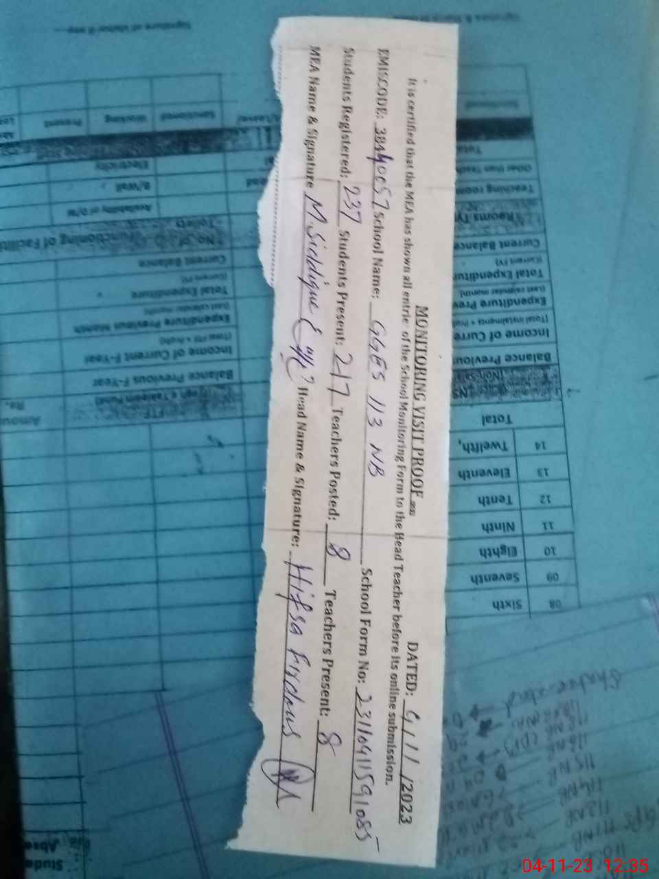 | Attendance Register | Head Teacher | MEA with School | Visit Proof |