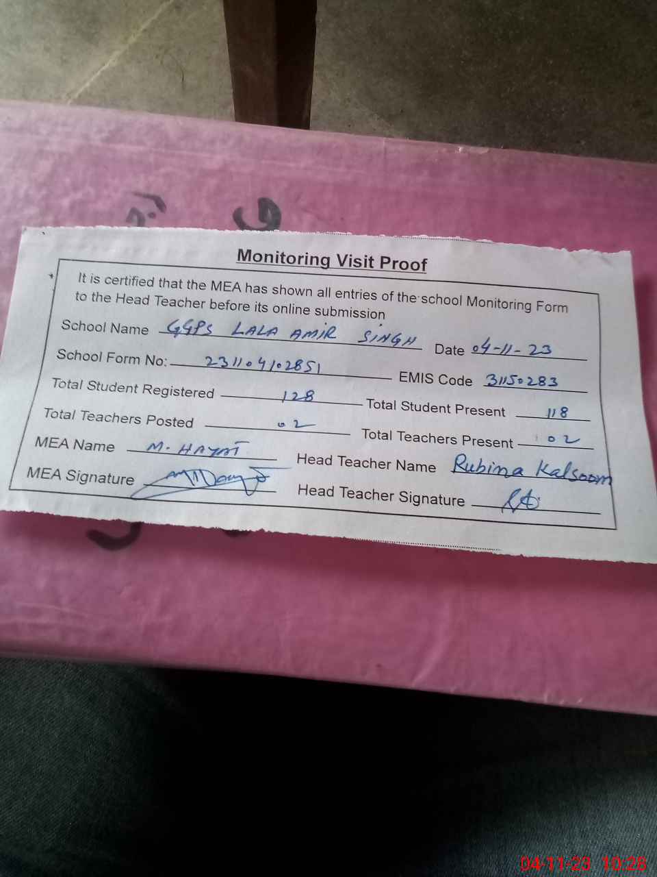| Attendance Register | Head Teacher | MEA with School | Visit Proof |