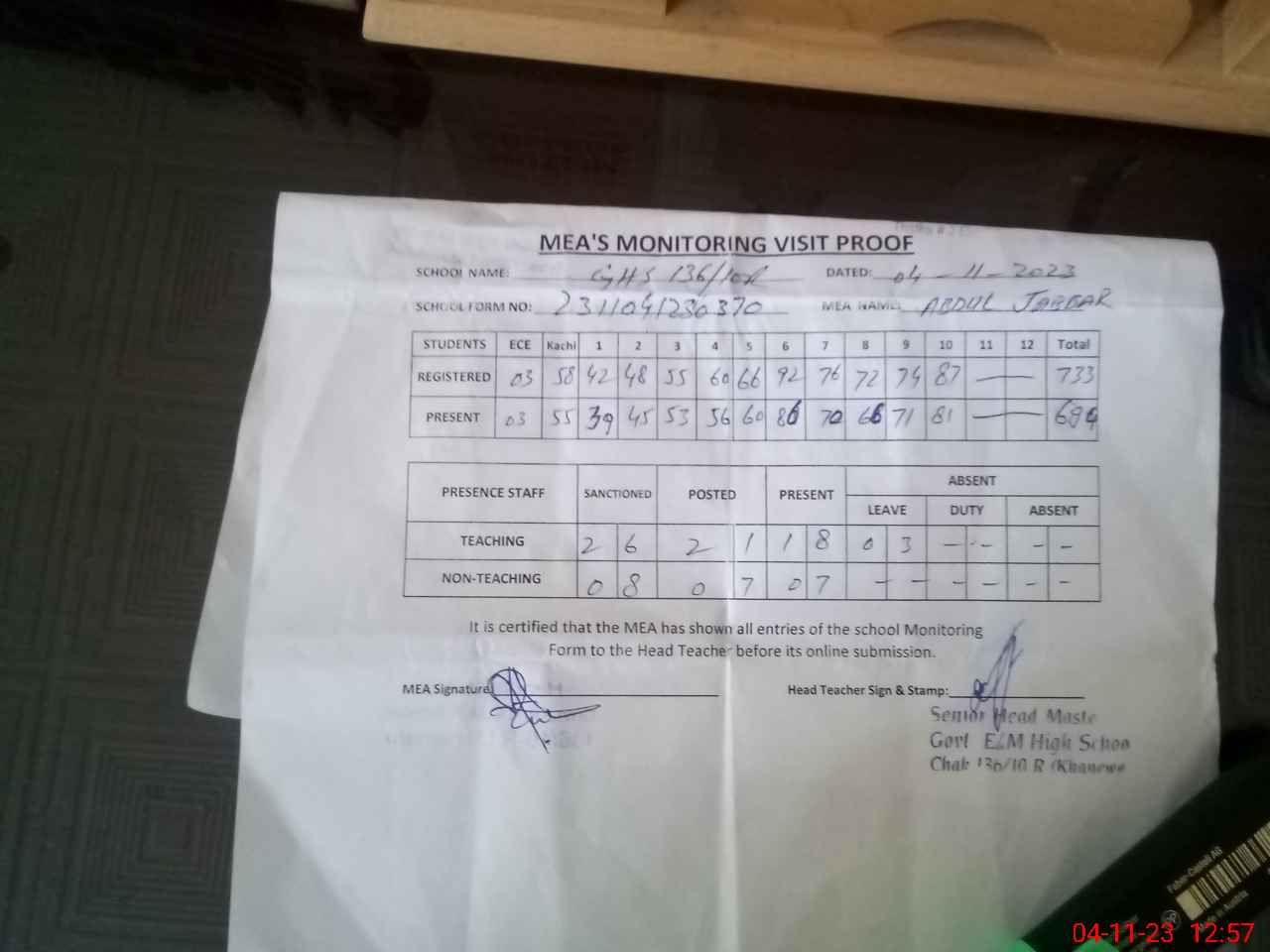 | Attendance Register | Head Teacher | MEA with School | Visit Proof |