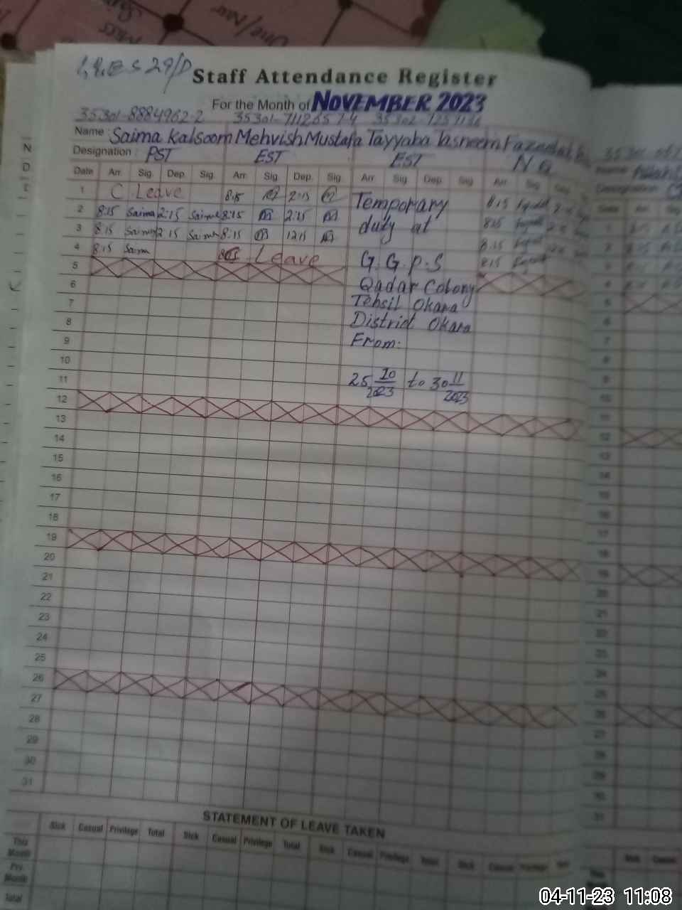 | 36**** | Kh**** Pe**** | 1 | 2 | 3 | 0 | 0 | 0 | 0 | 0 | 0 | 2 | Exam Duty | |