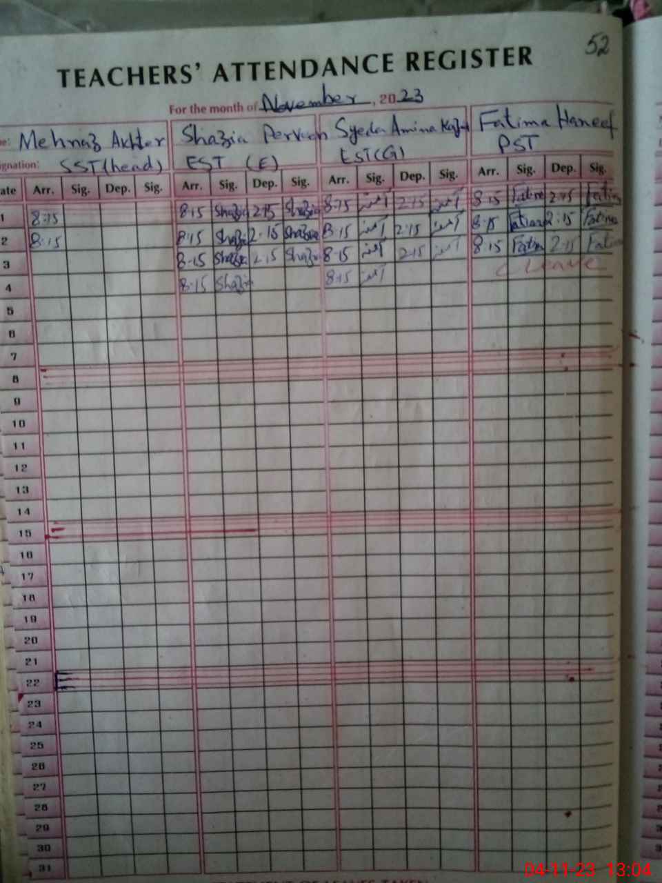 | No. of Students Present - Female | 0 | 0 | 24 | 11 | 13 | 12 | 7 | 6 | 15 | 8 | 8 | 104 | ||||