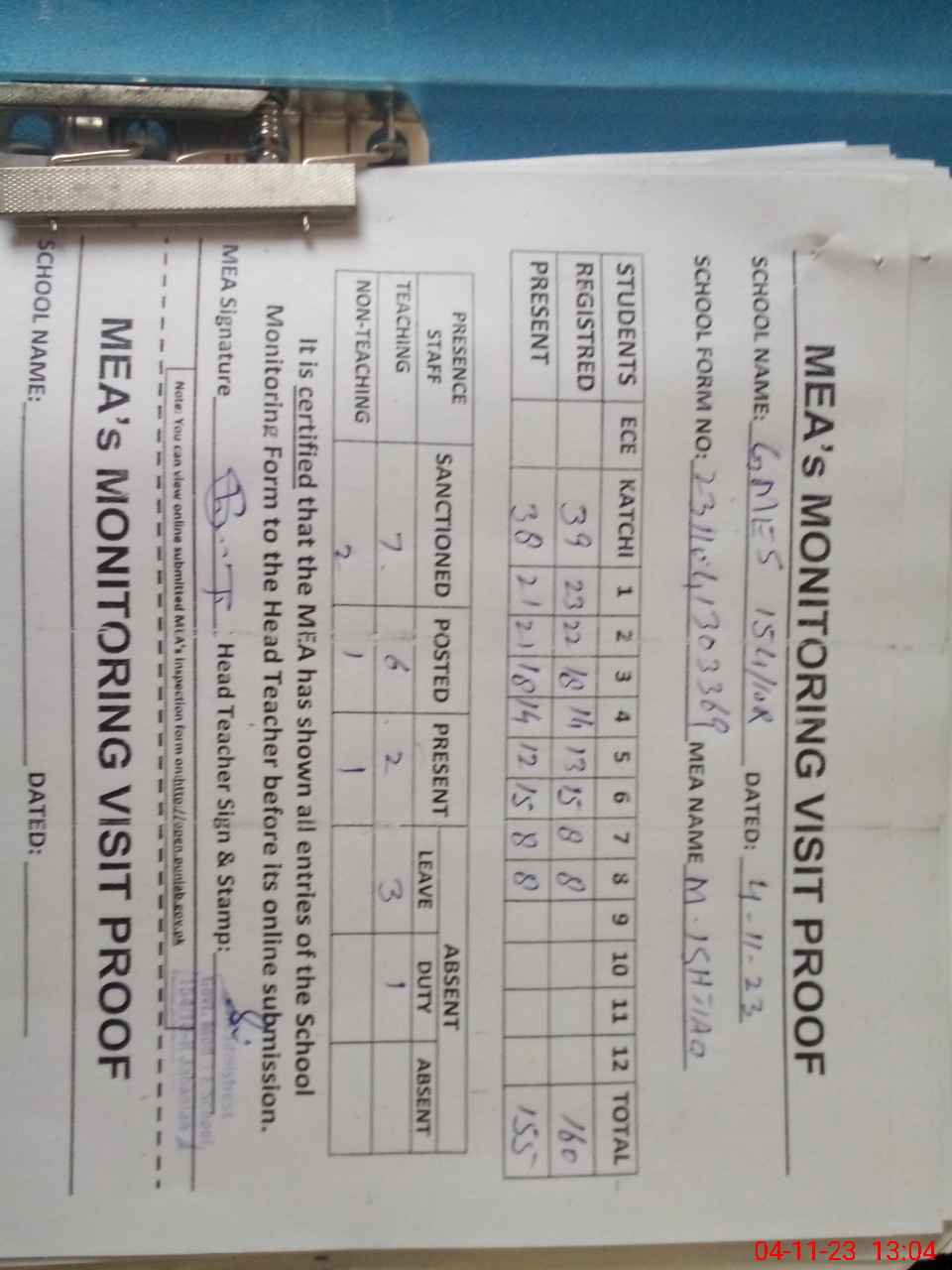 | Attendance Register | Head Teacher | MEA with School | Visit Proof |