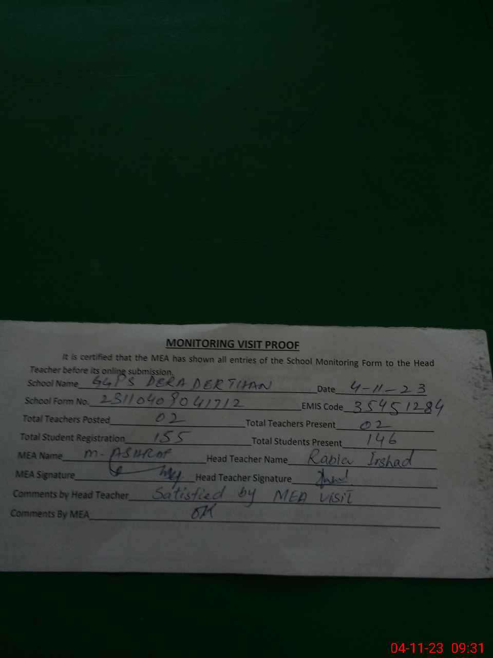 | Attendance Register | Head Teacher | MEA with School | Visit Proof |