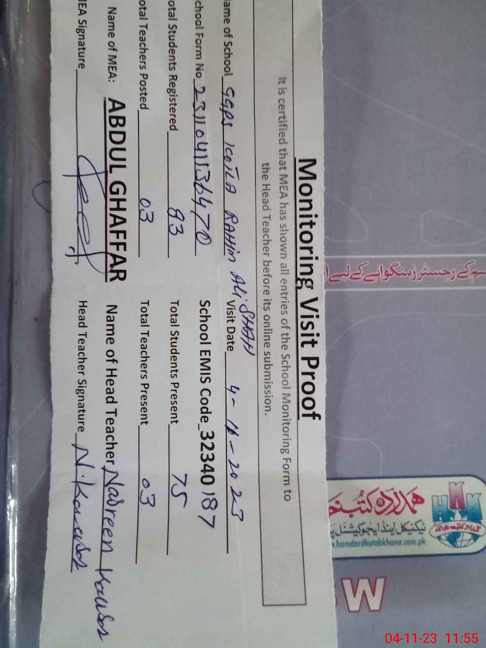 | EMIS Code: 32340187 | Name of School: GGPS KOTLA RAHAM ALI SHAH | |||