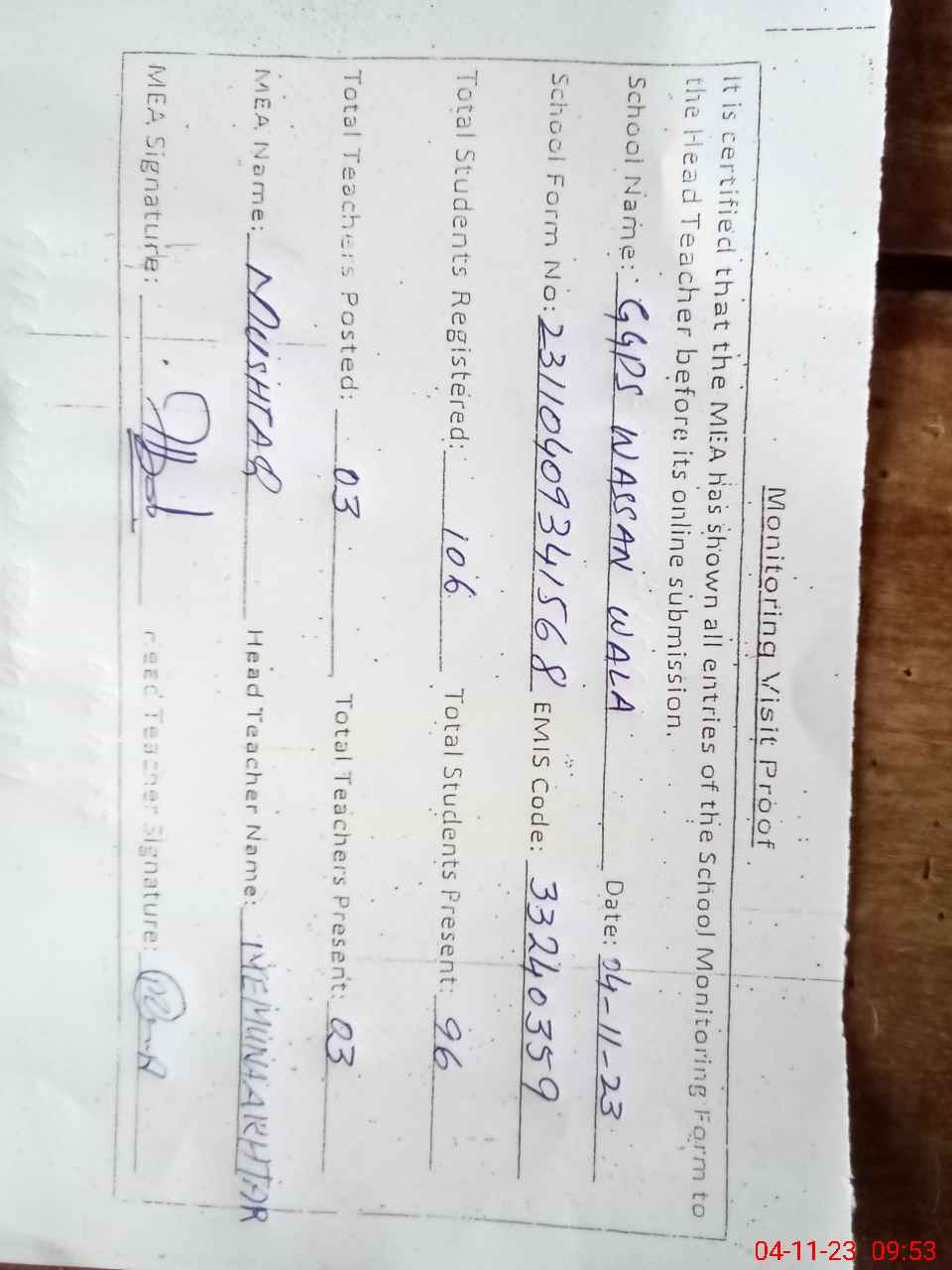| EMIS Code: 33240359 | Name of School: GGPS WASSAN WALA | |||