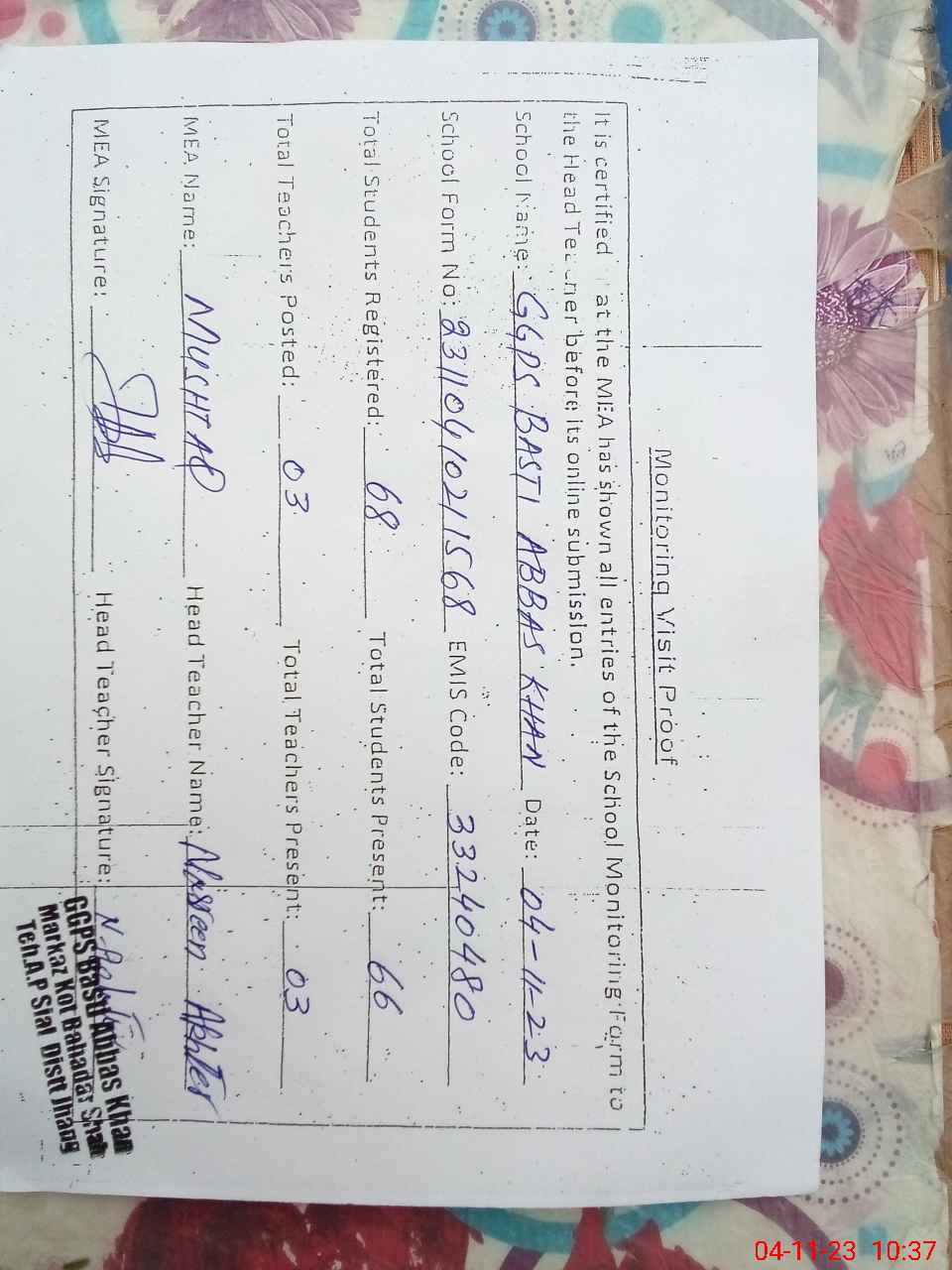 | EMIS Code: 33240480 | Name of School: GGPS BASTI ABBAS KHAN | |||