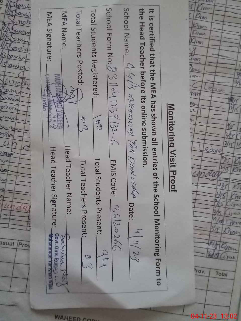 | EMIS Code: 36120266 | Name of School: GGPS MUHAMAD YAR KHAN WALA SHUJABAD | |||