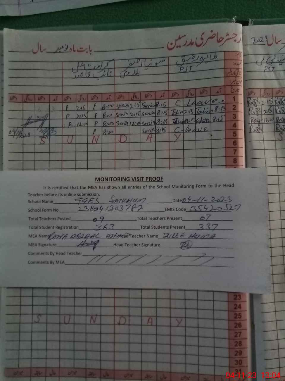 | Attendance Register | Head Teacher | MEA with School | Visit Proof |